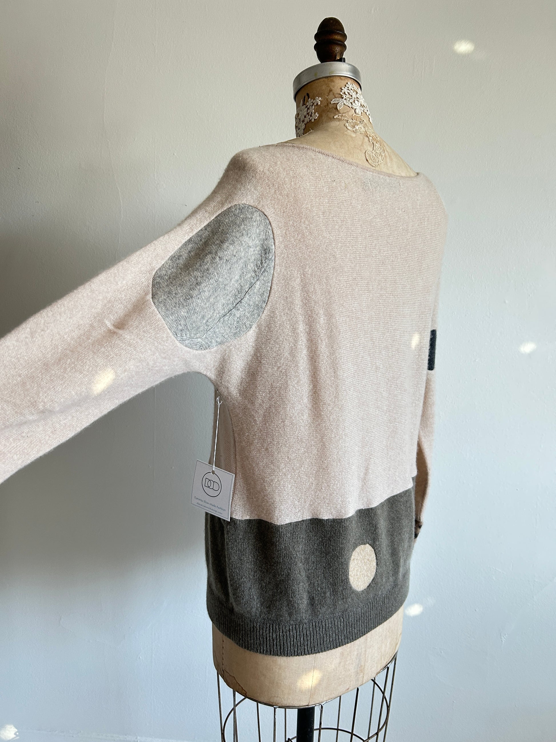 This upcycled cashmere sweater is eco chic, with one-of-a-kind, thoughtfully placed, inset patches - making it a modern piece of wearable art.