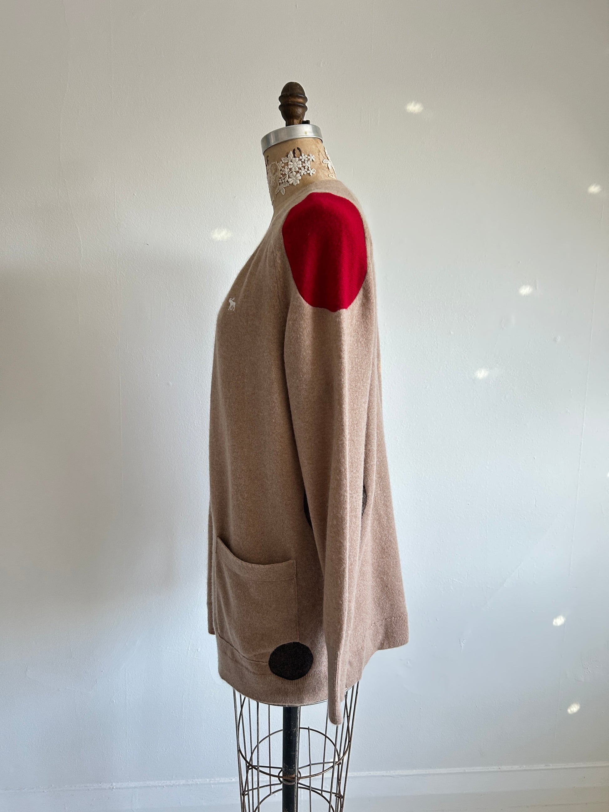 This upcycled cashmere sweater is eco chic, with one-of-a-kind, thoughtfully placed, inset patches - making it a modern piece of wearable art.