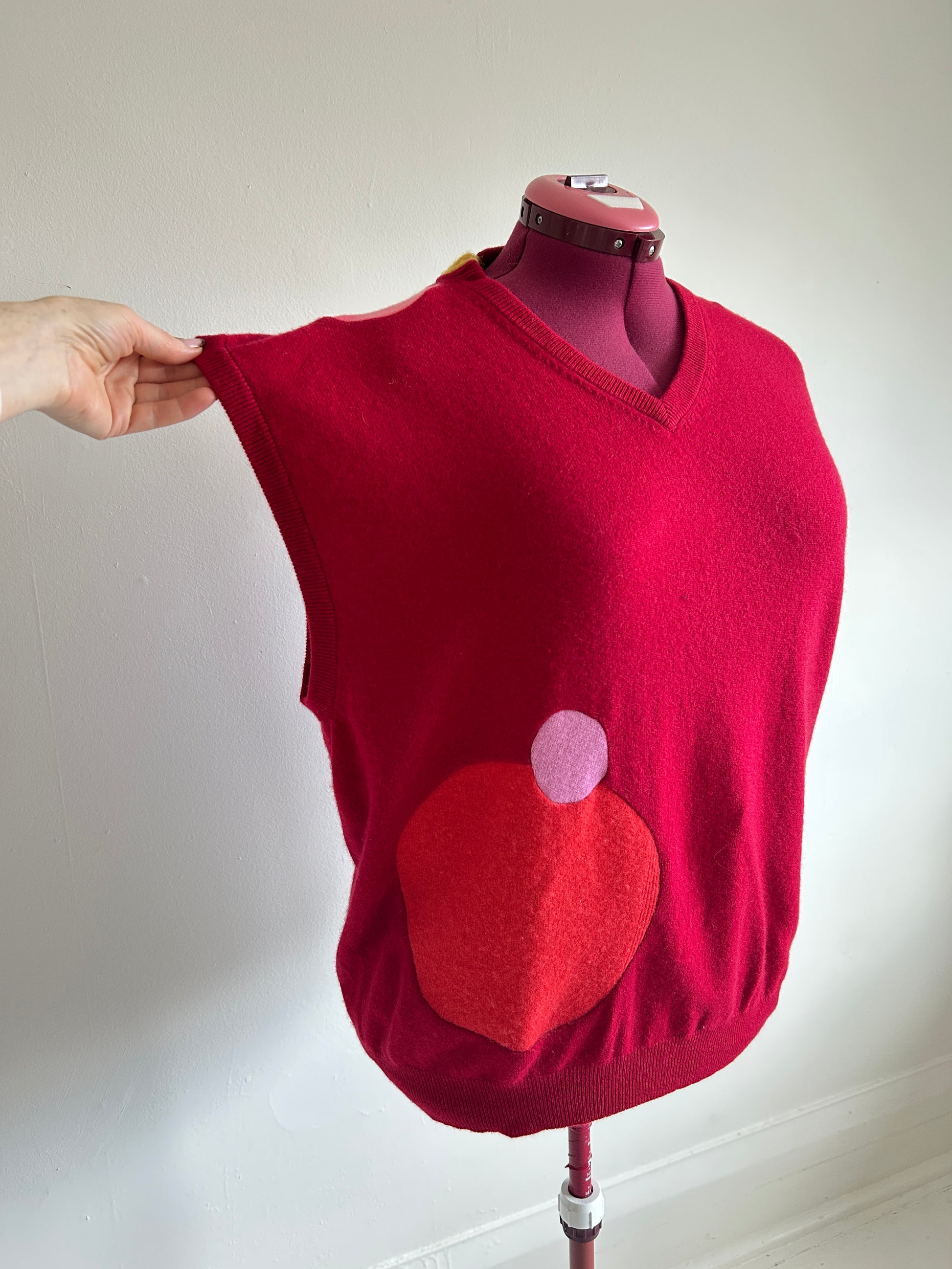 This upcycled cashmere sweater vest is eco chic, with one-of-a-kind, thoughtfully placed, inset patches to repair this preloved sweater - making it a modern piece of wearable art.
