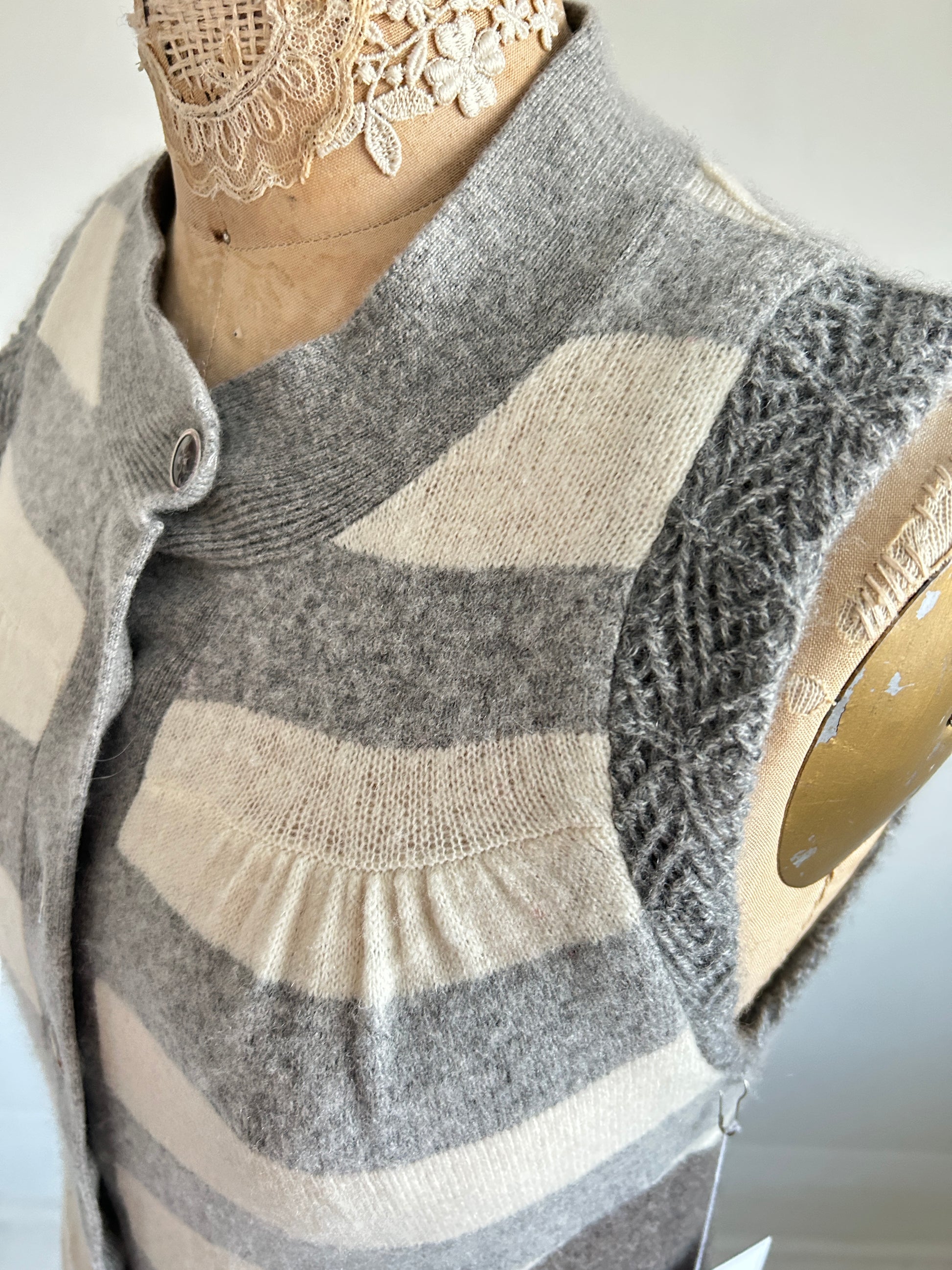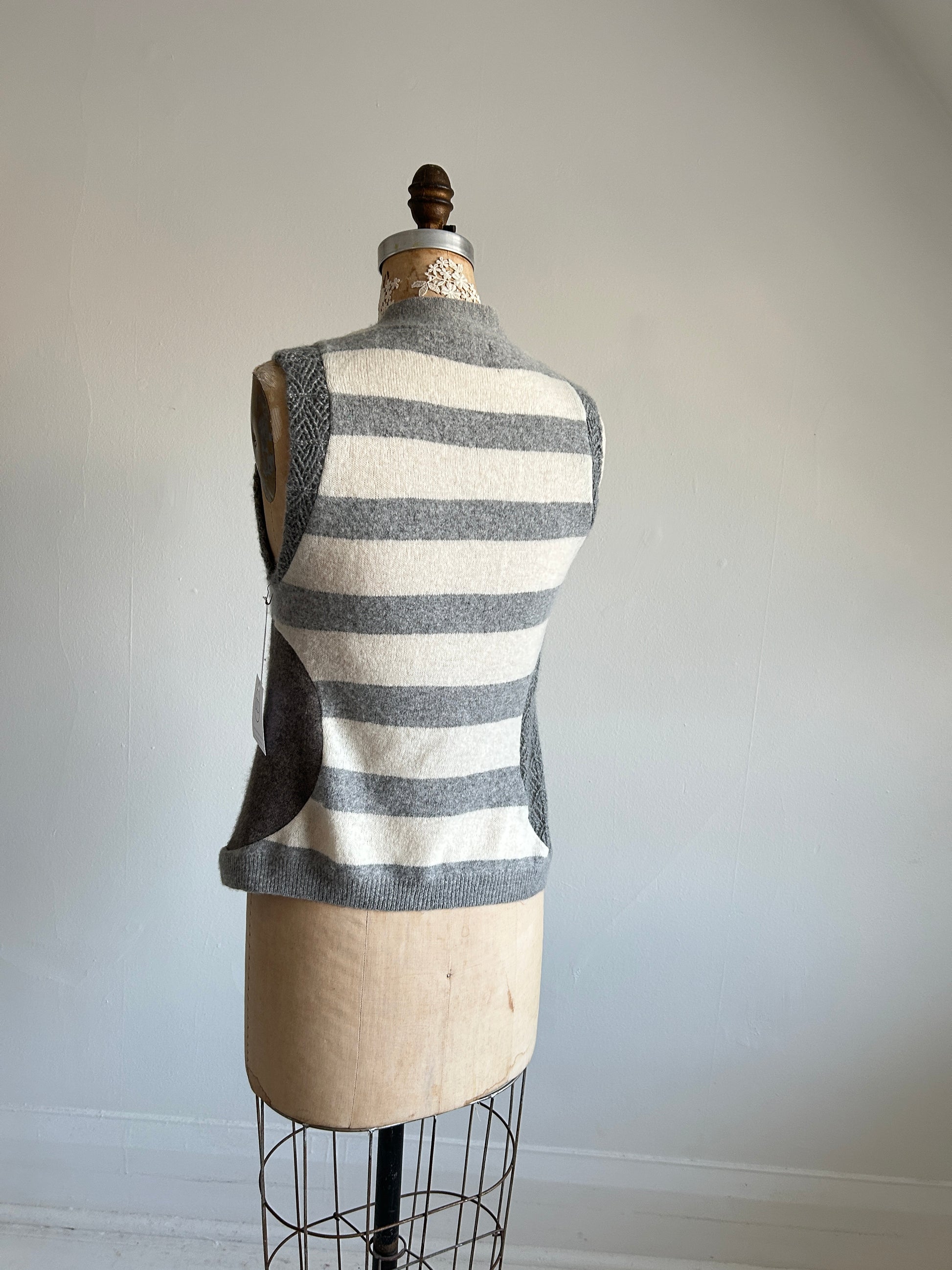 This upcycled cashmere sweater vest is eco chic, with one-of-a-kind, thoughtfully placed, inset patches to repair this preloved sweater - making it a modern piece of wearable art.