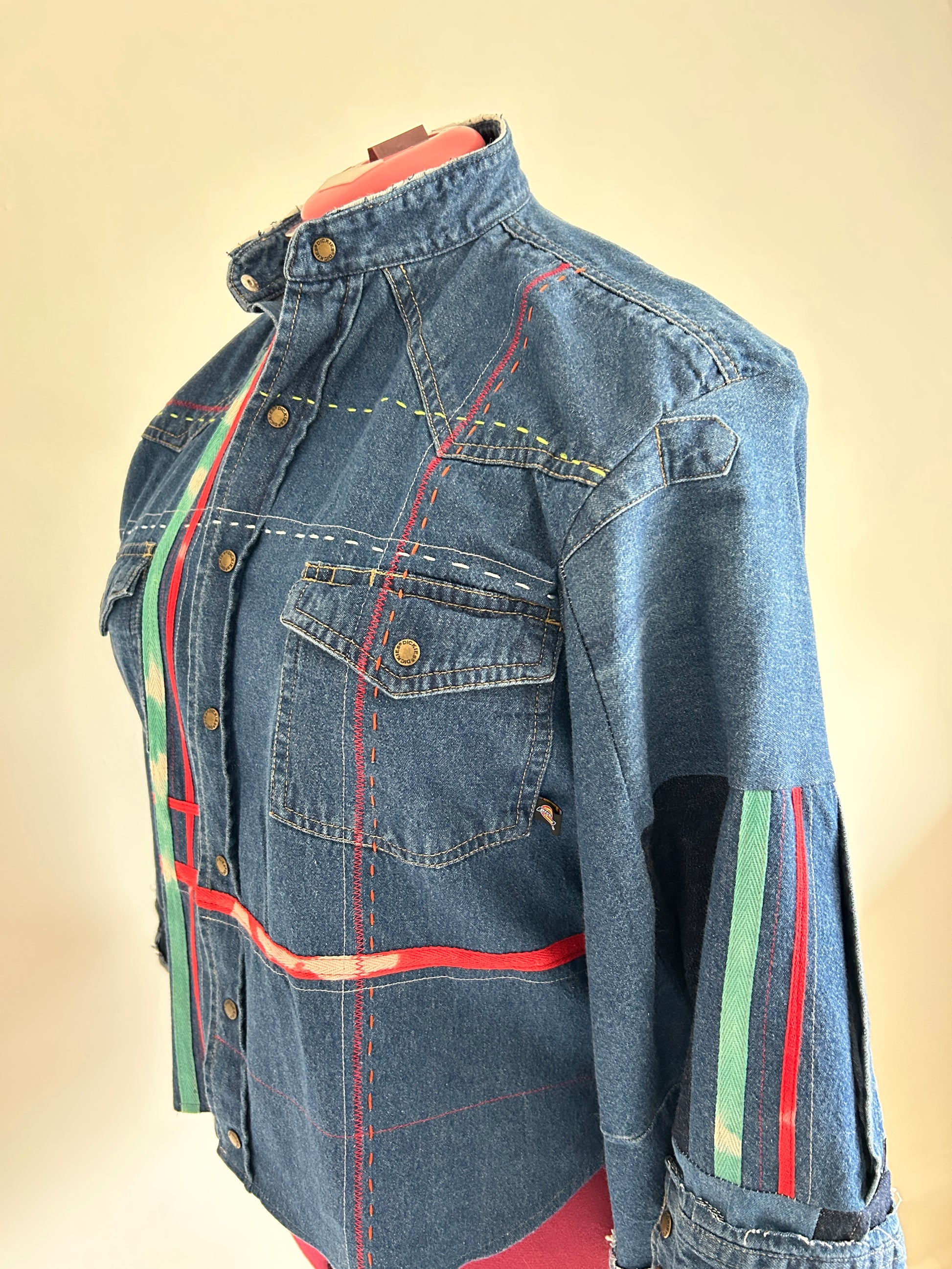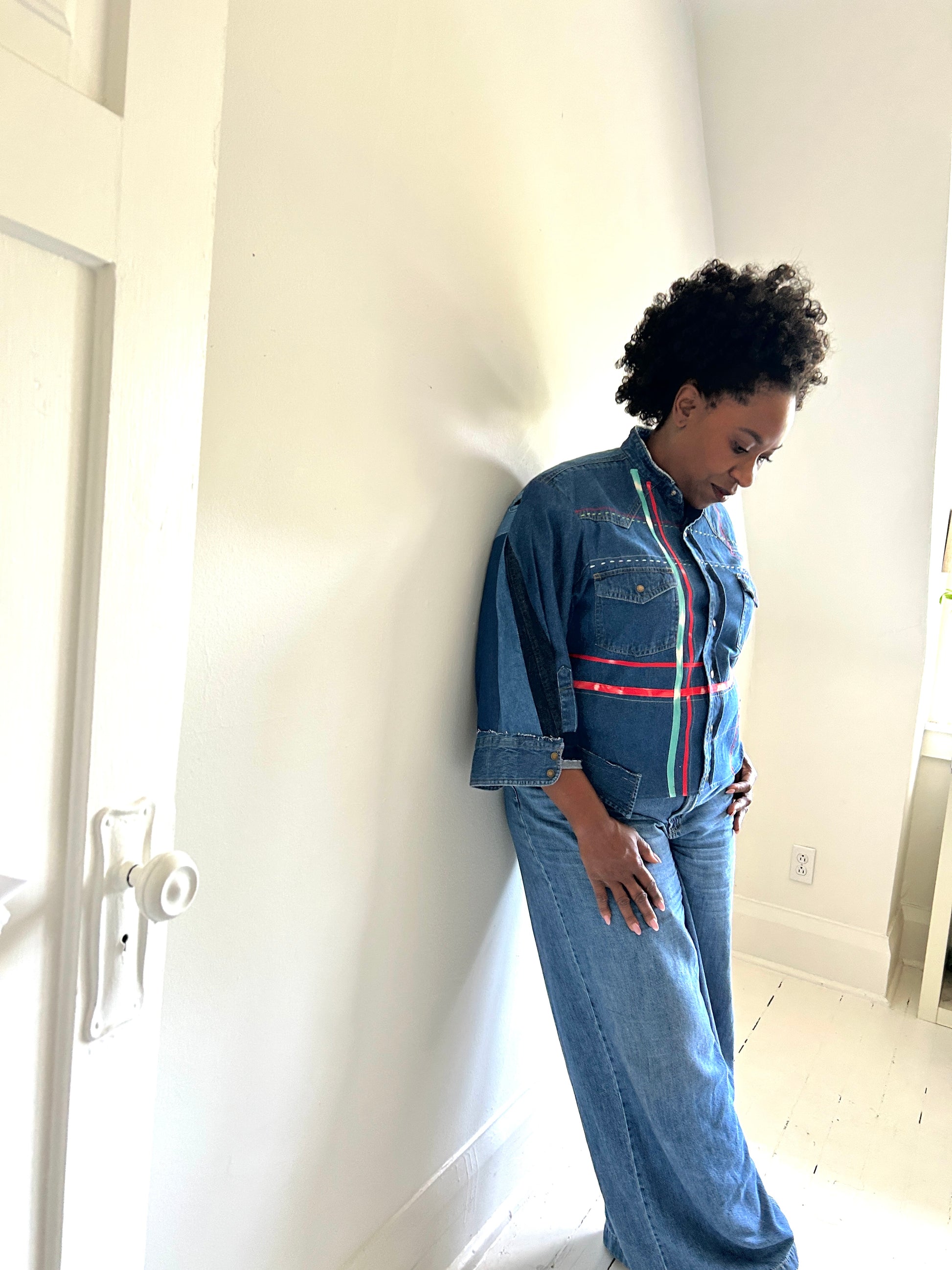 The Ellis shirt is made from repurposed denim & cotton shirts. The armholes are widened and added patchworked denim wide sleeves