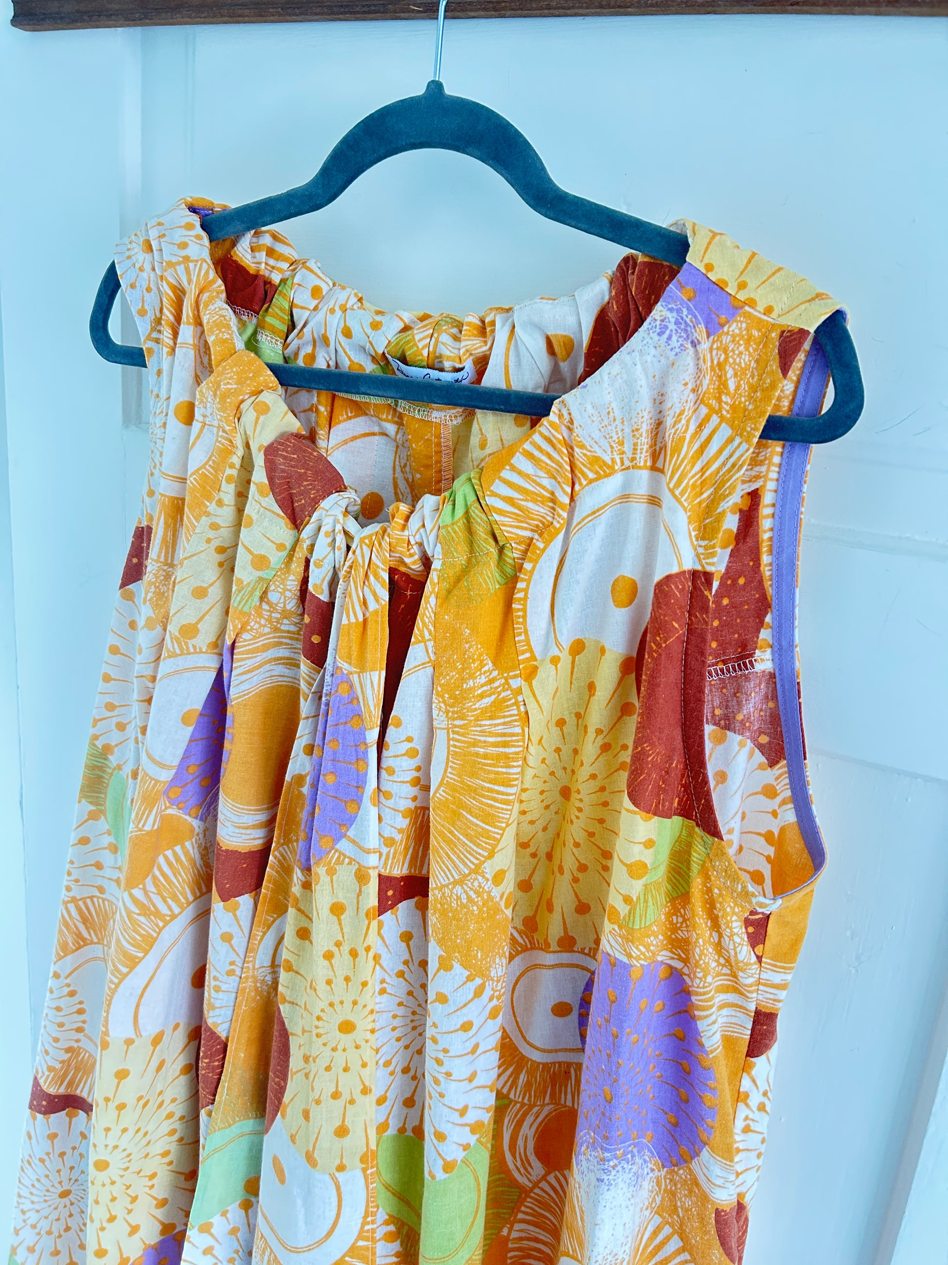 One size fits most with a drawstring & pleated neck line. You decide the neck line you’re after, V-neck, scooped, off the shoulder or cinched to the neck. The matching tie can be loose and carefree or tied in a big bow.