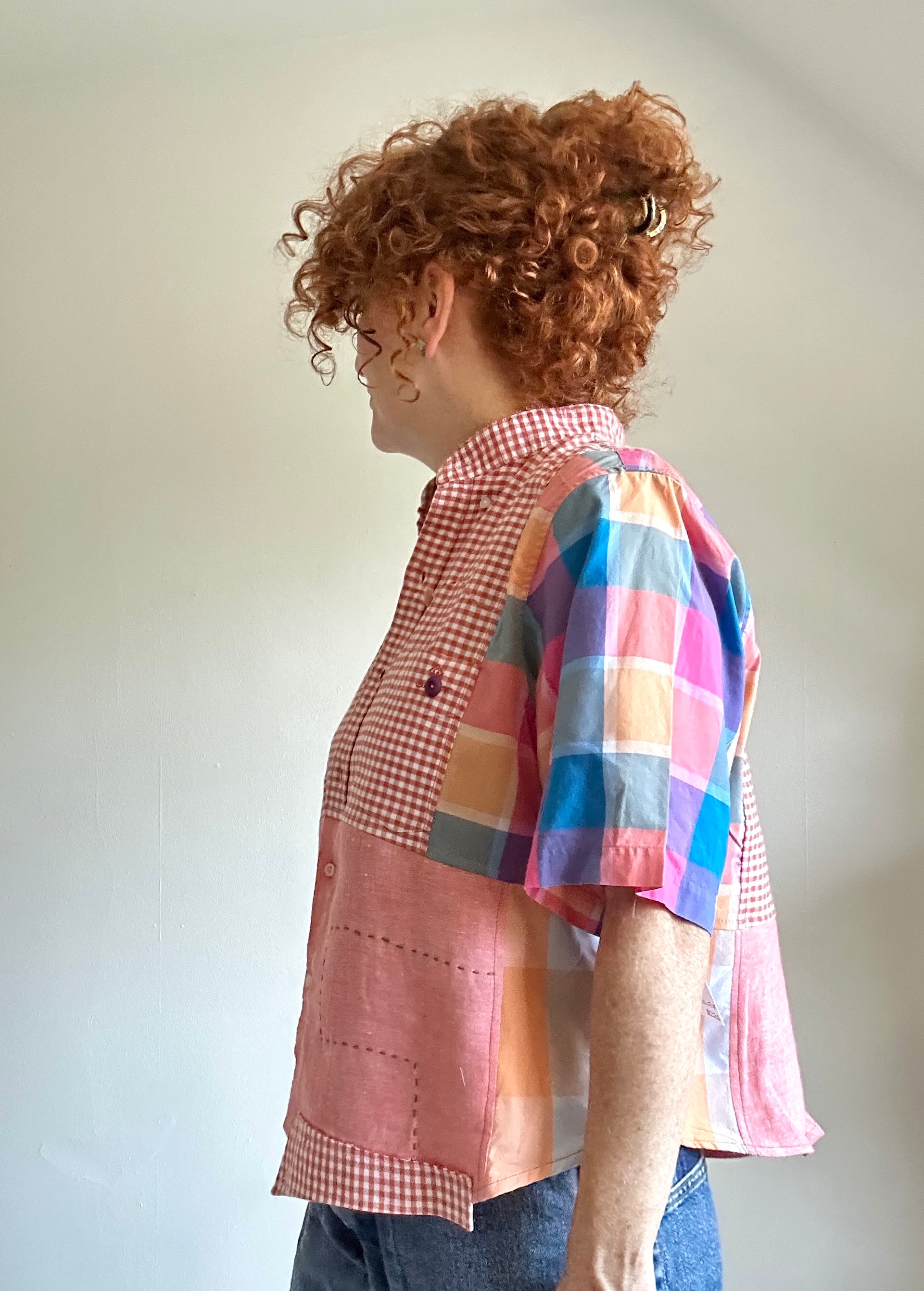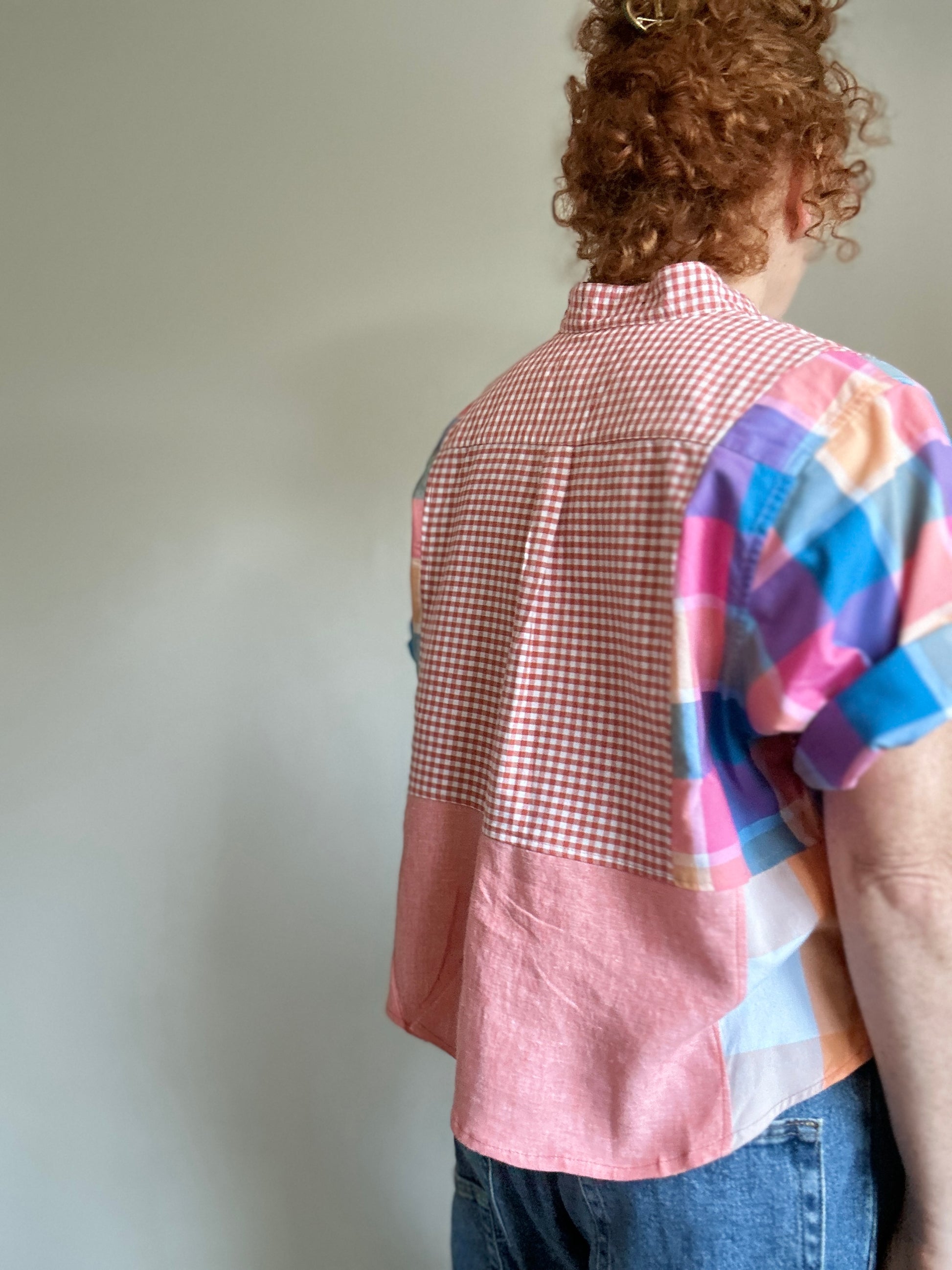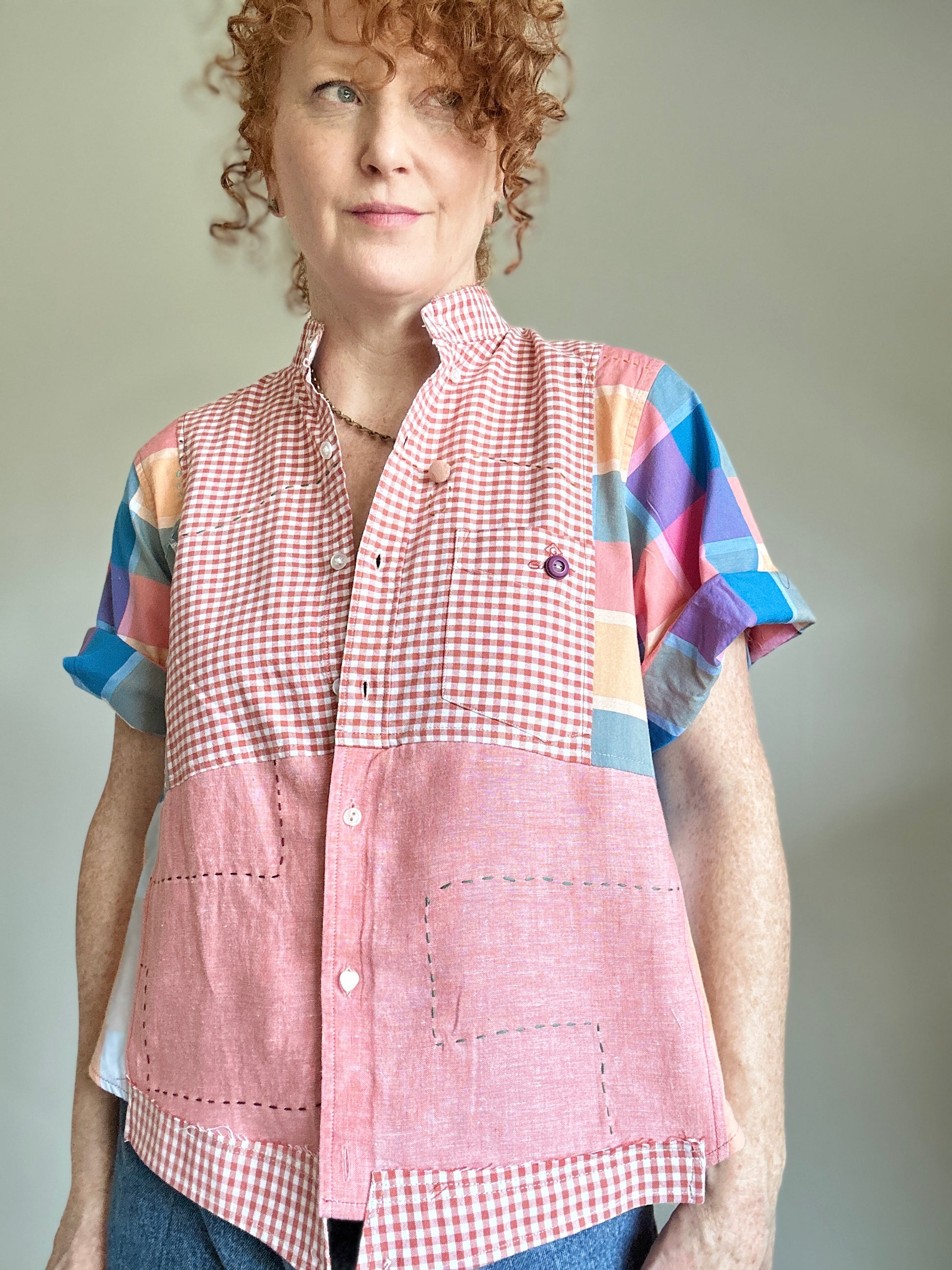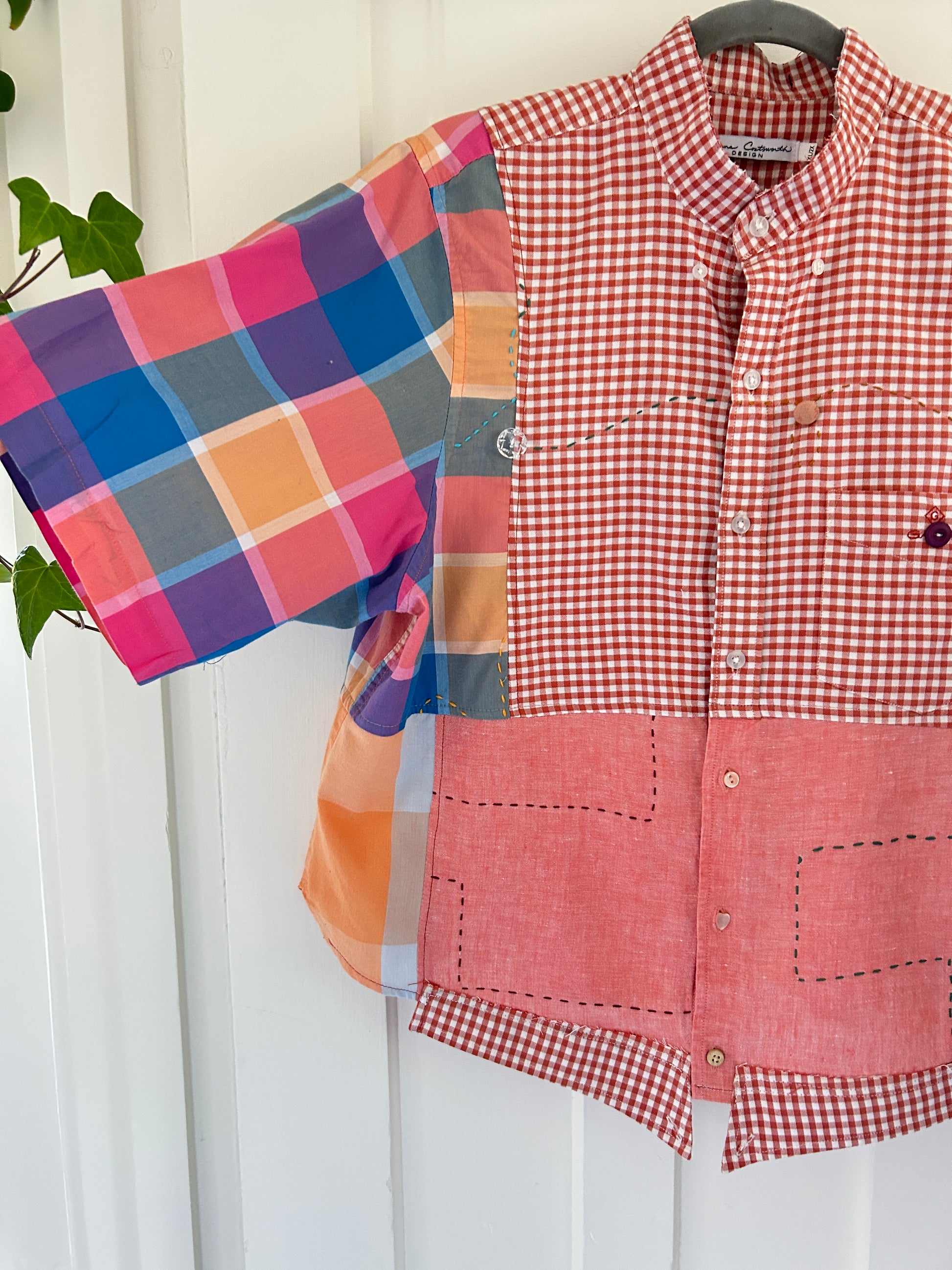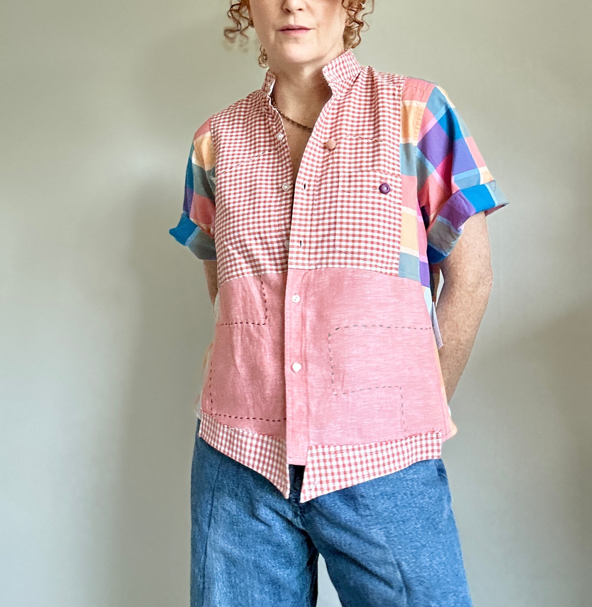 The shirt is made from repurposed buttondown shirts.