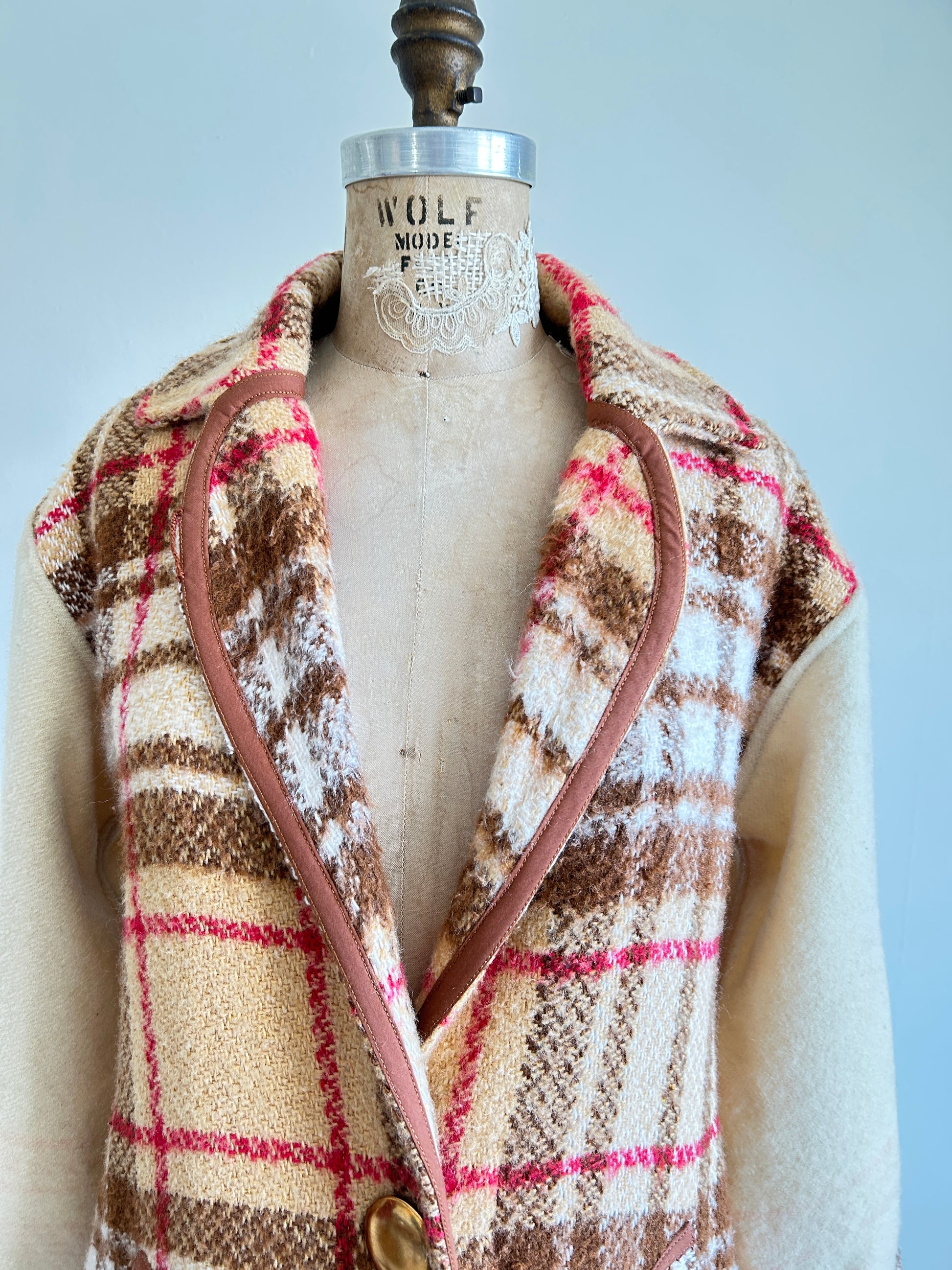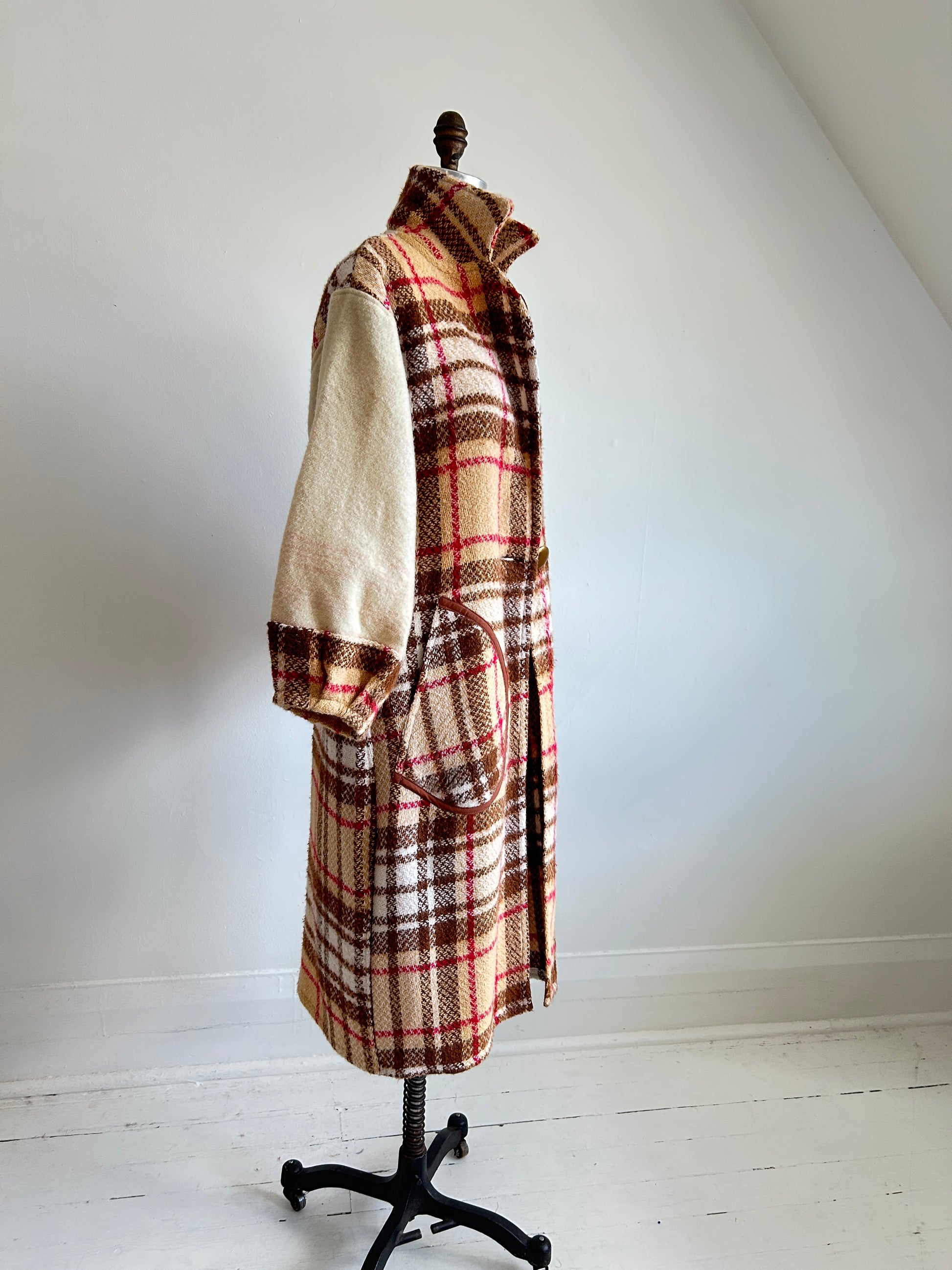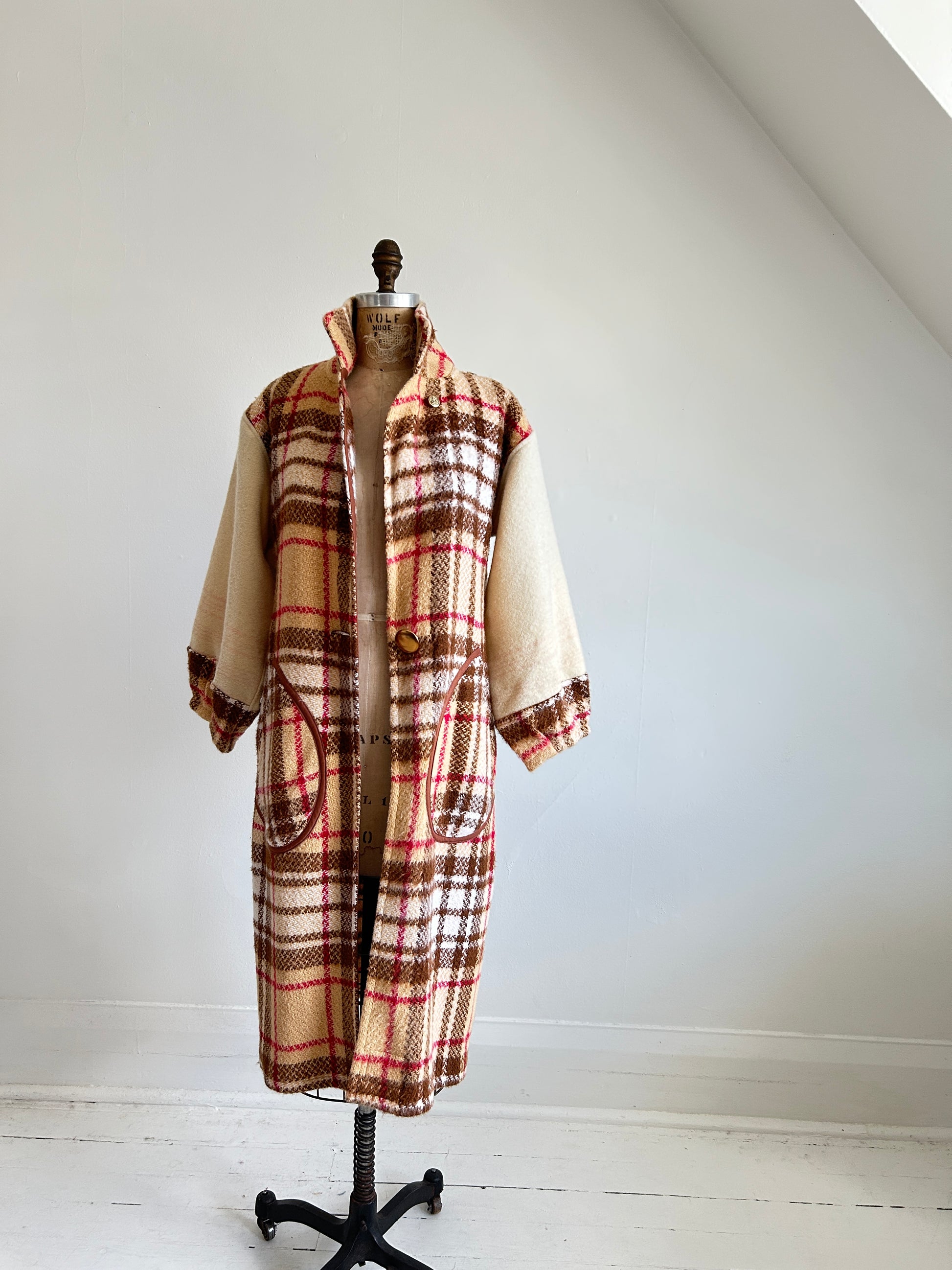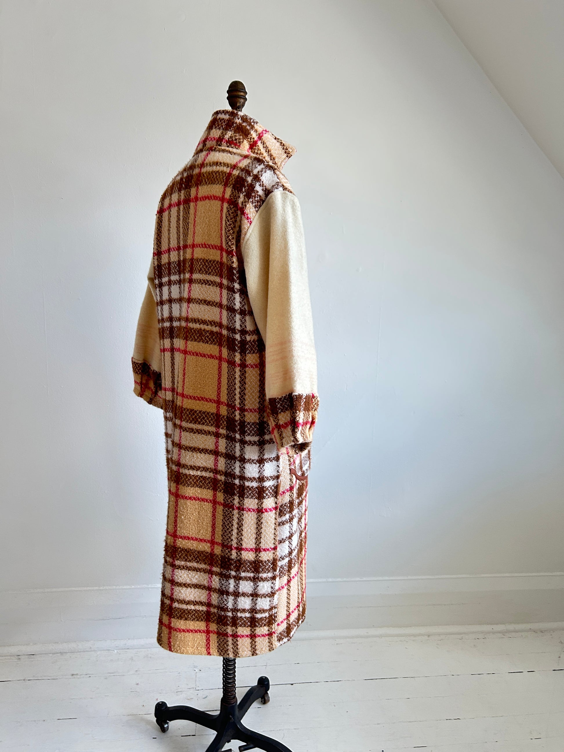 Trench coat made with upcycled textiles: vintage wool blankets