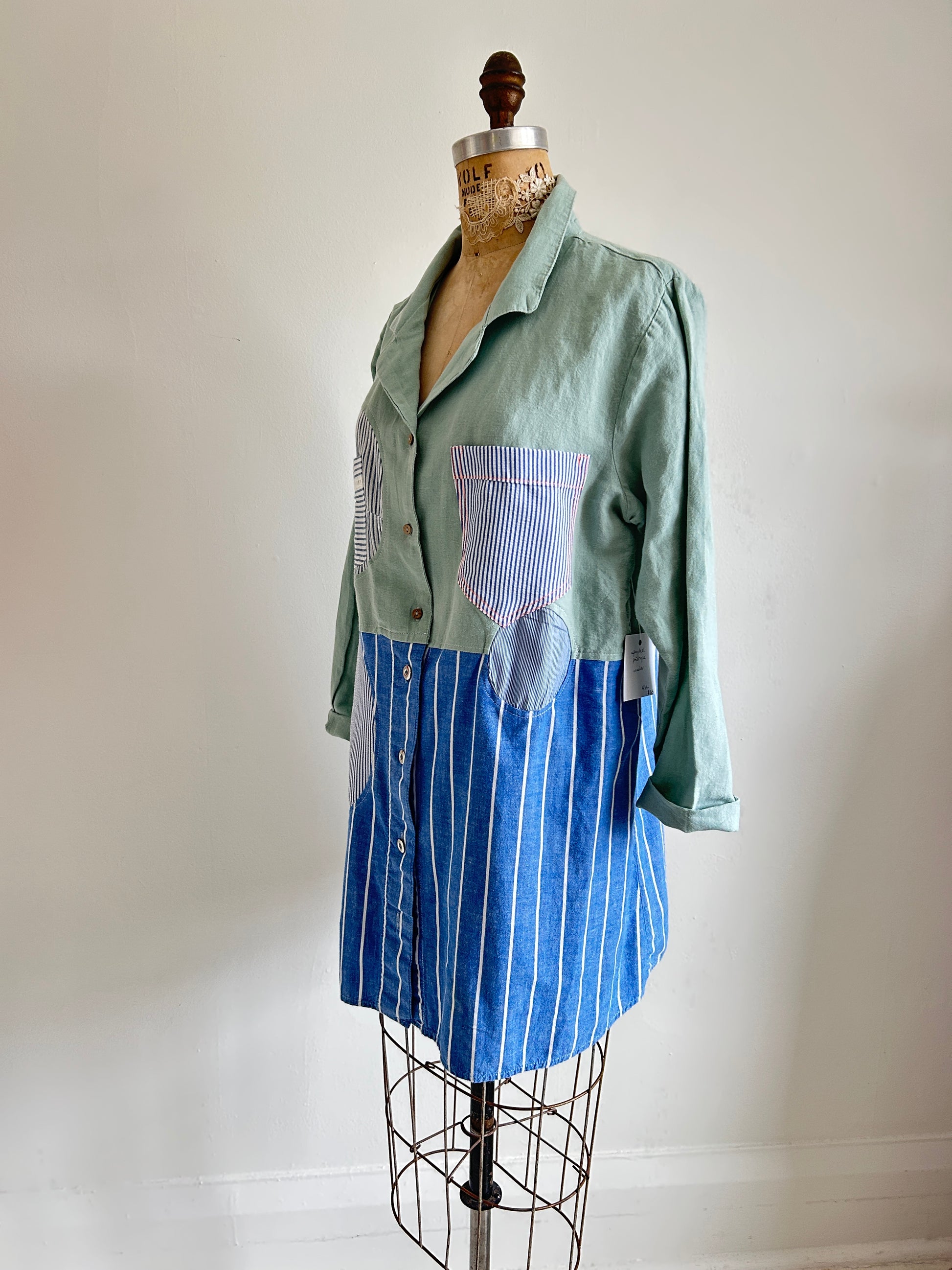 Upcycled Modern Workwear Pinstripe Shirt - Circle Series Size L/XL #PIN22