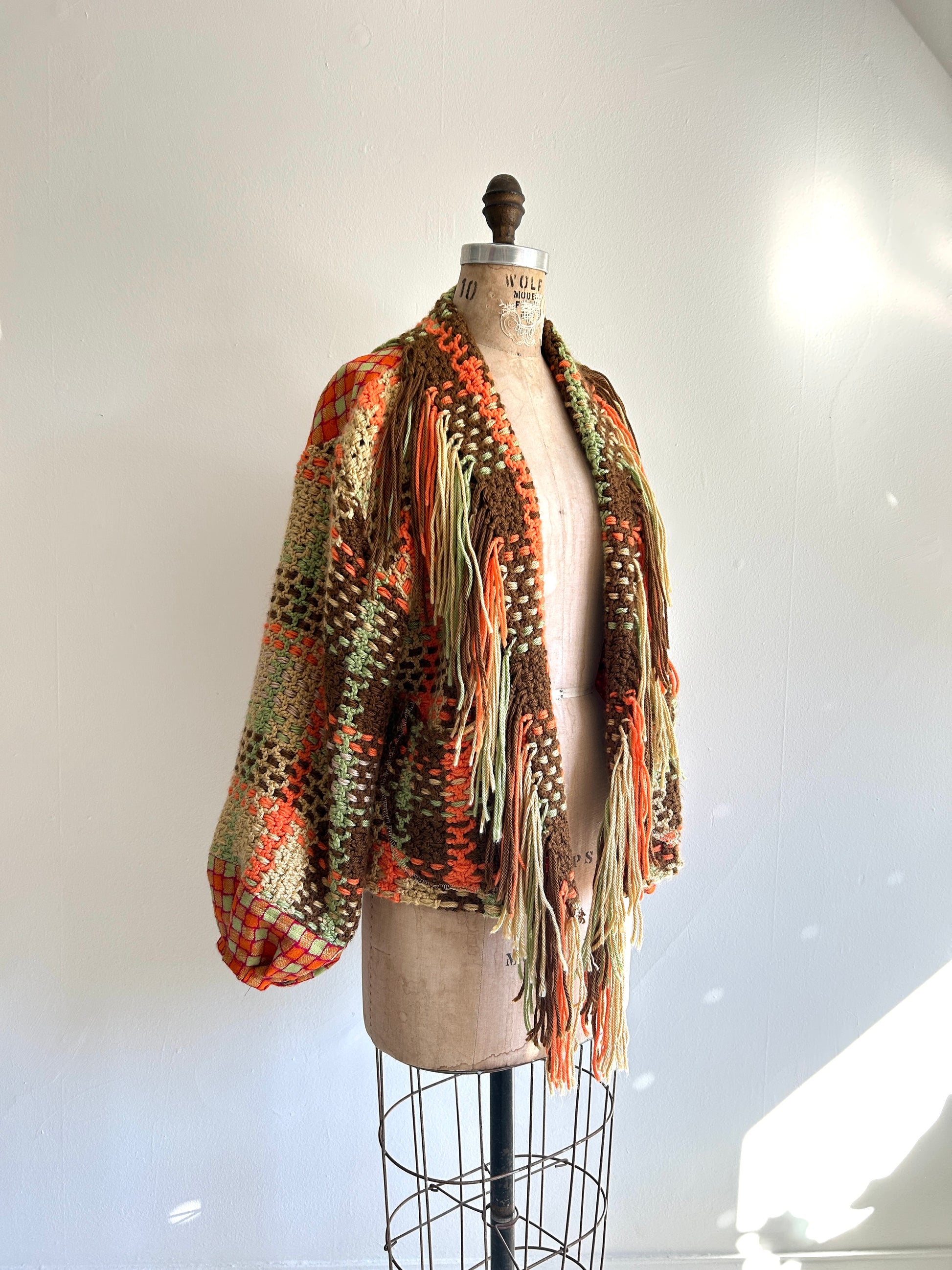 Upcycled vintage afghan in shade of the 70s turned into stunning cropped length Vivianne jacket