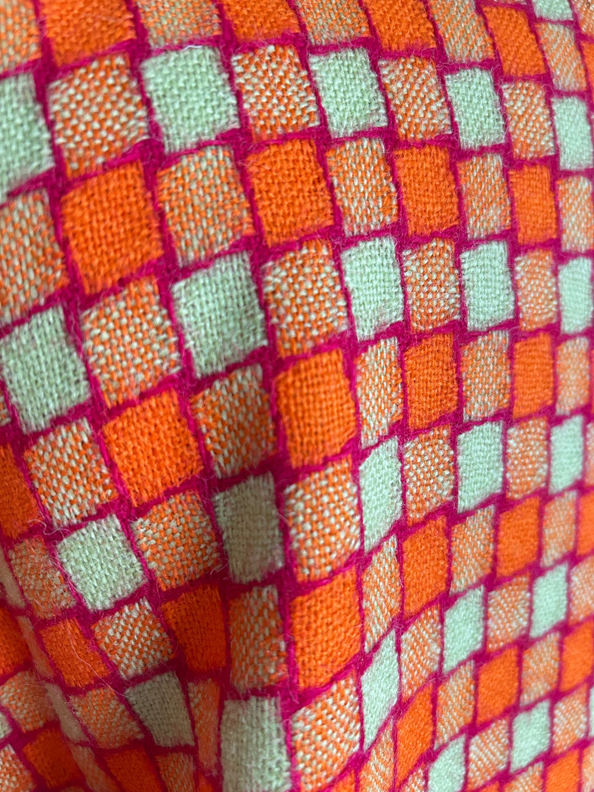 Bold check in orange, lime and cherry colours in vintage lightweight and drapey wool.