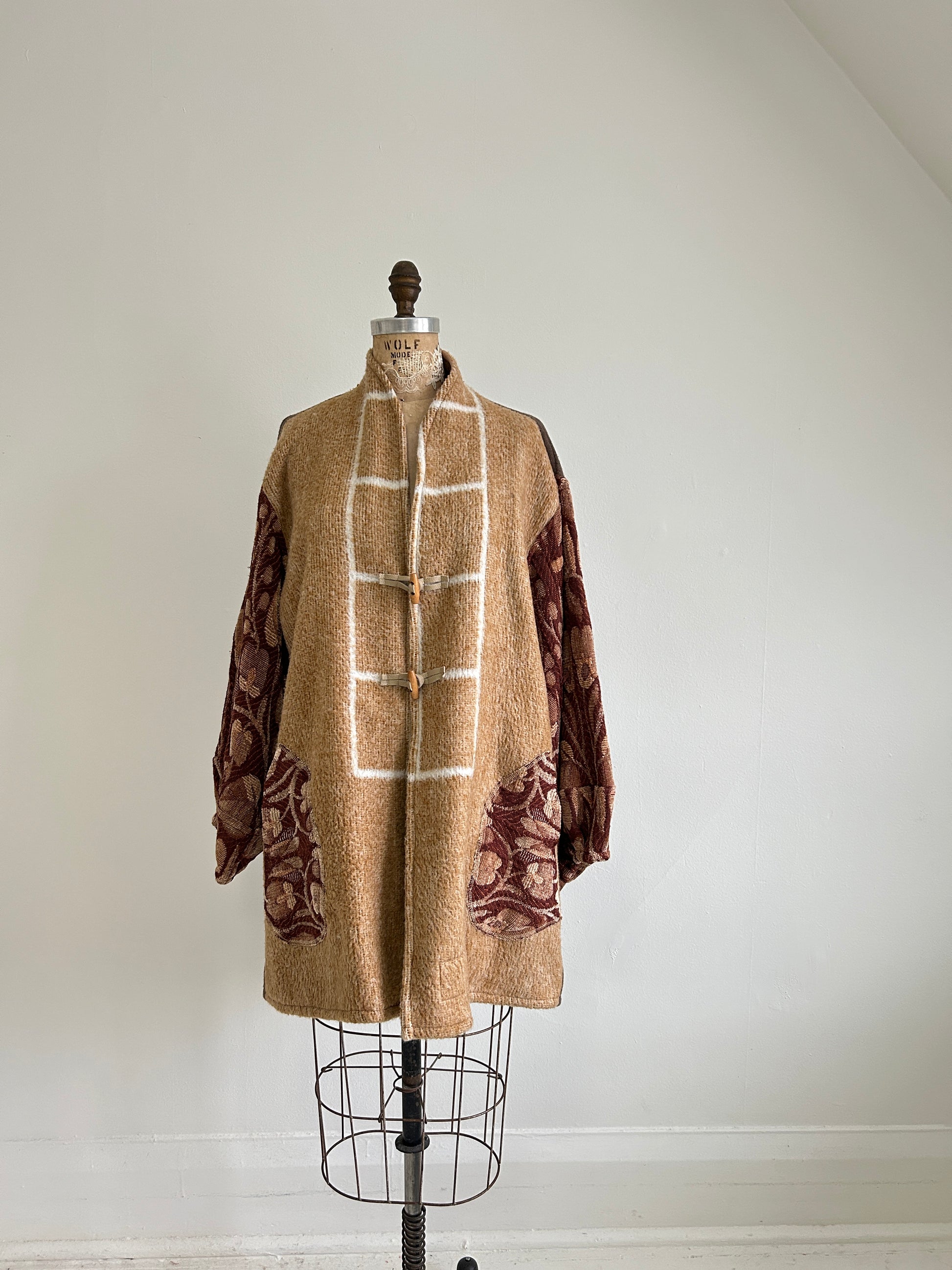 Standing collar with leather and wooden toggles lightweight wool back, medium weight wool (blend?) front and medium weight drapey throw blanket sleeves